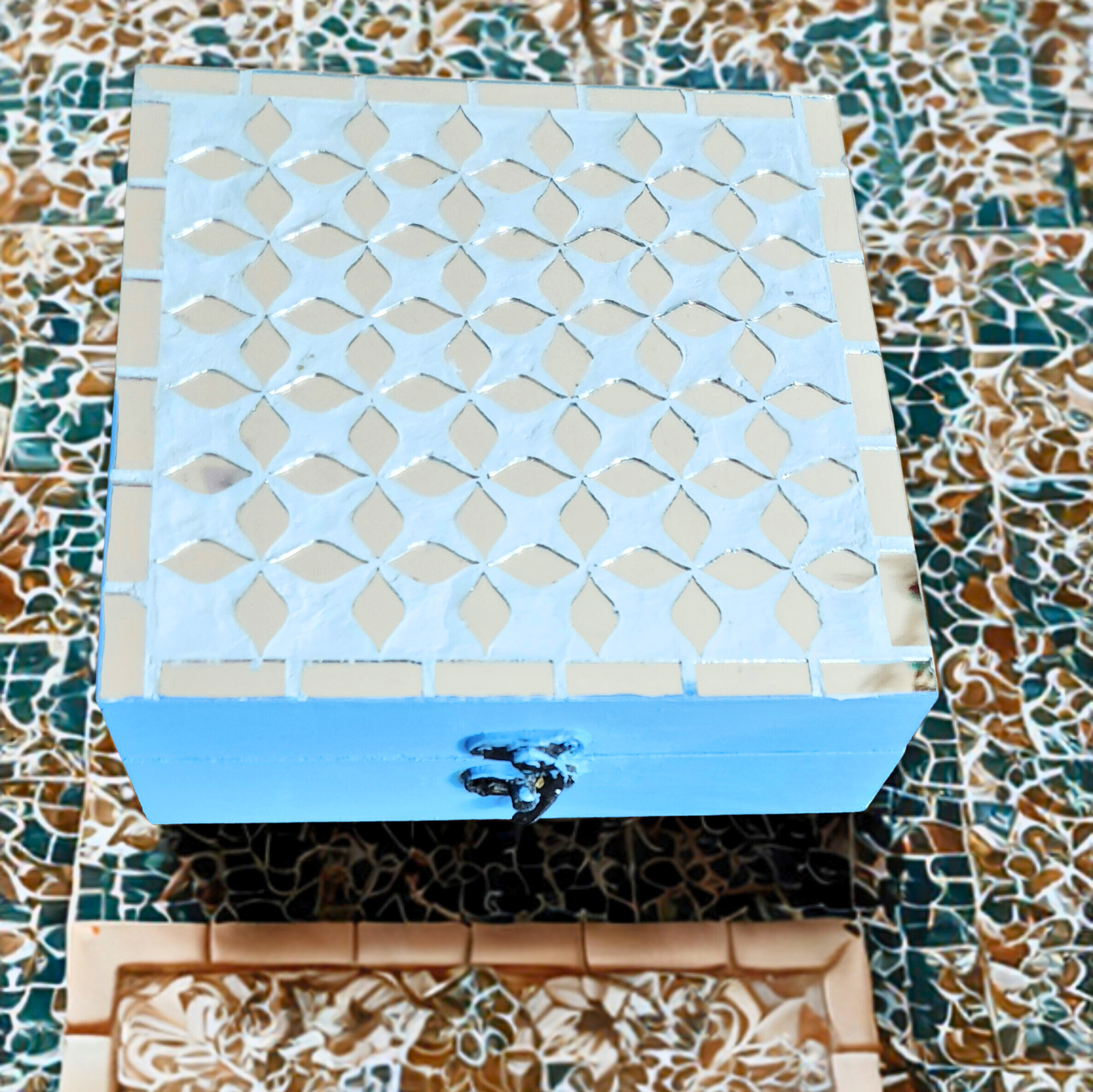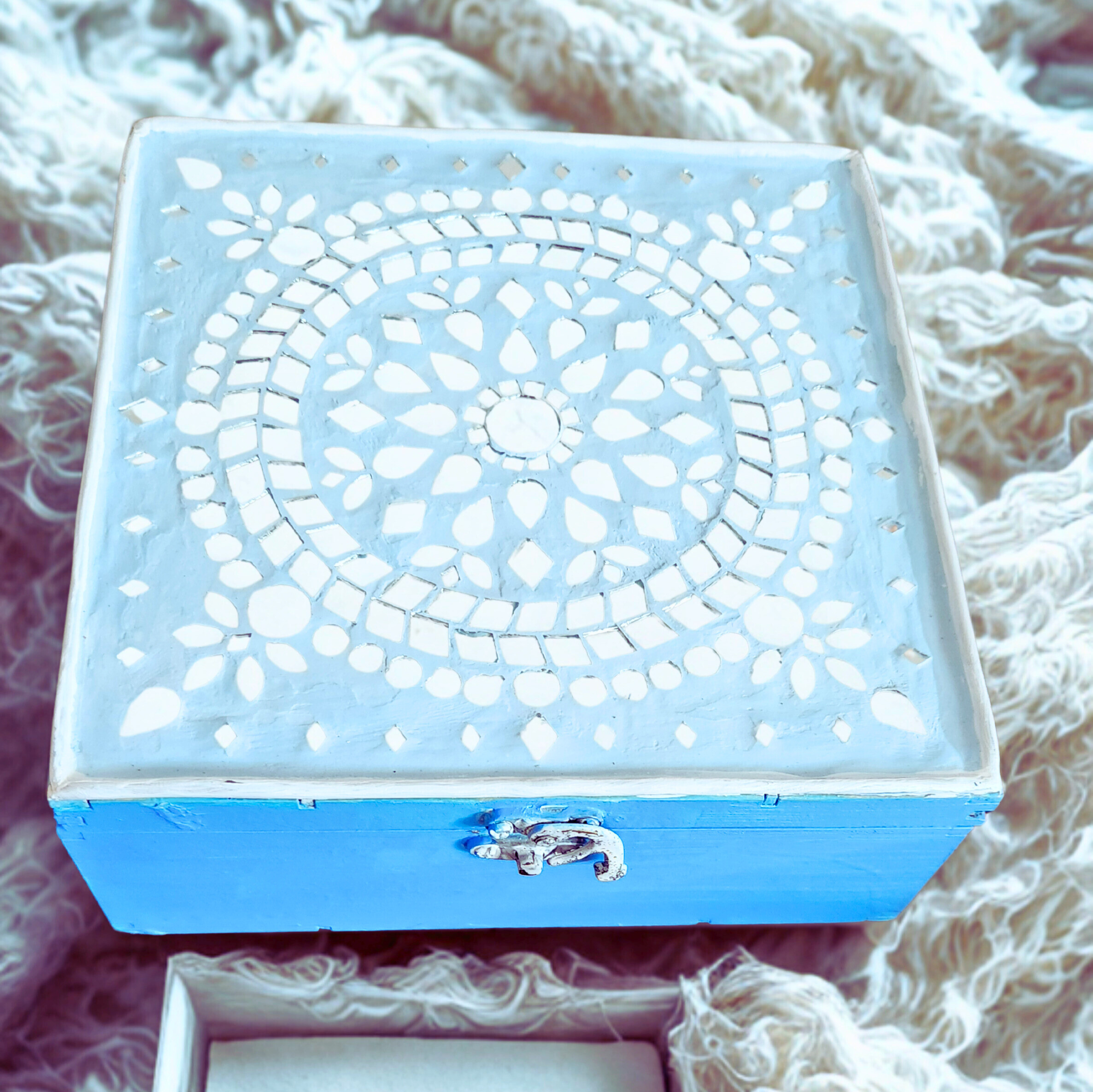 Square wooden jewellery/gift box, sky blue with white mandala dot-work on lid. Mirror tiles inlaid across top in geometric grid pattern. Ornate metal clasp. Two mirror styles — mandala and grid.