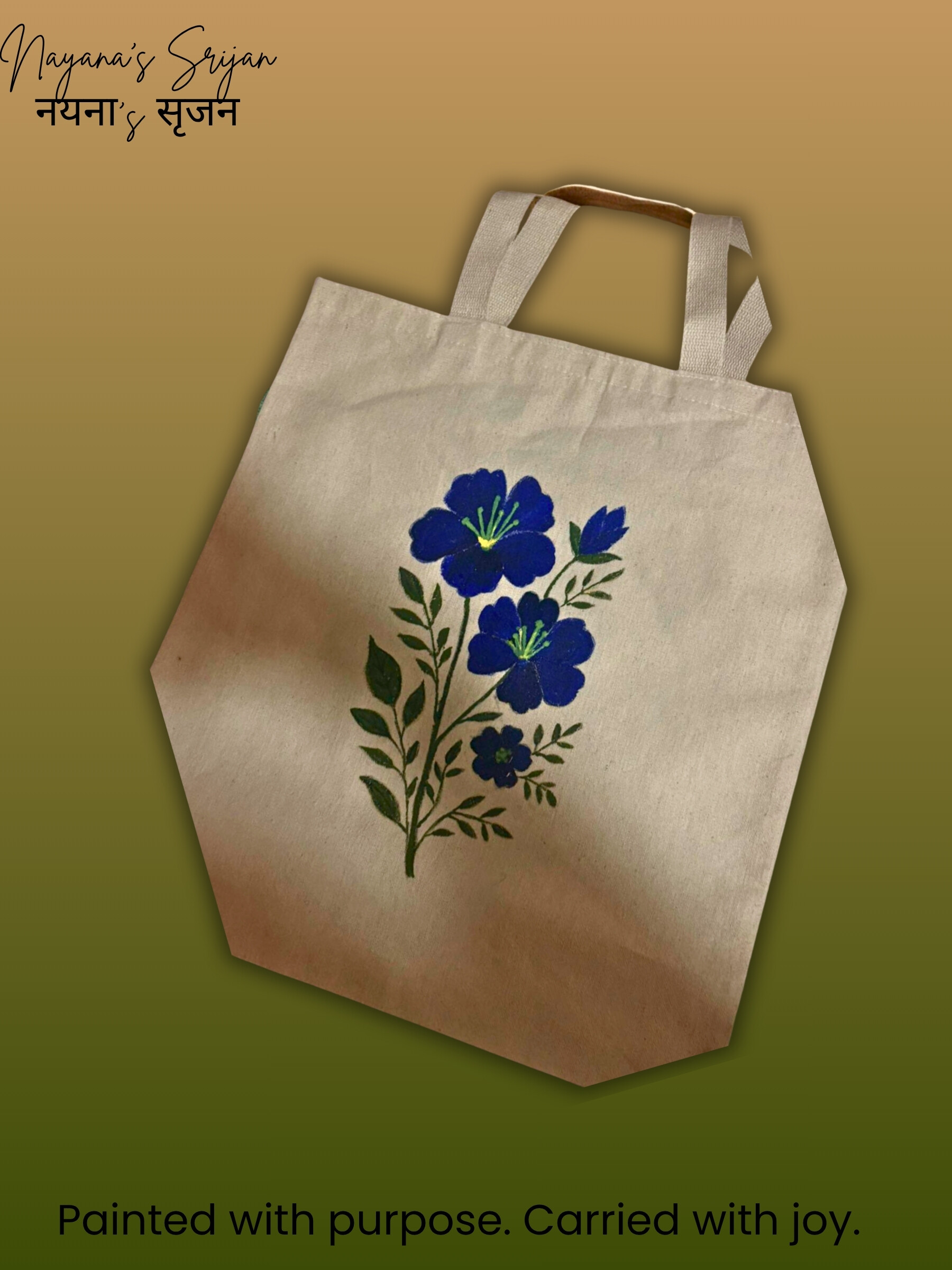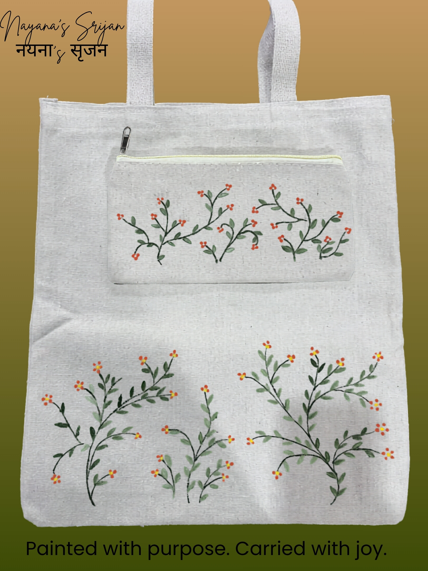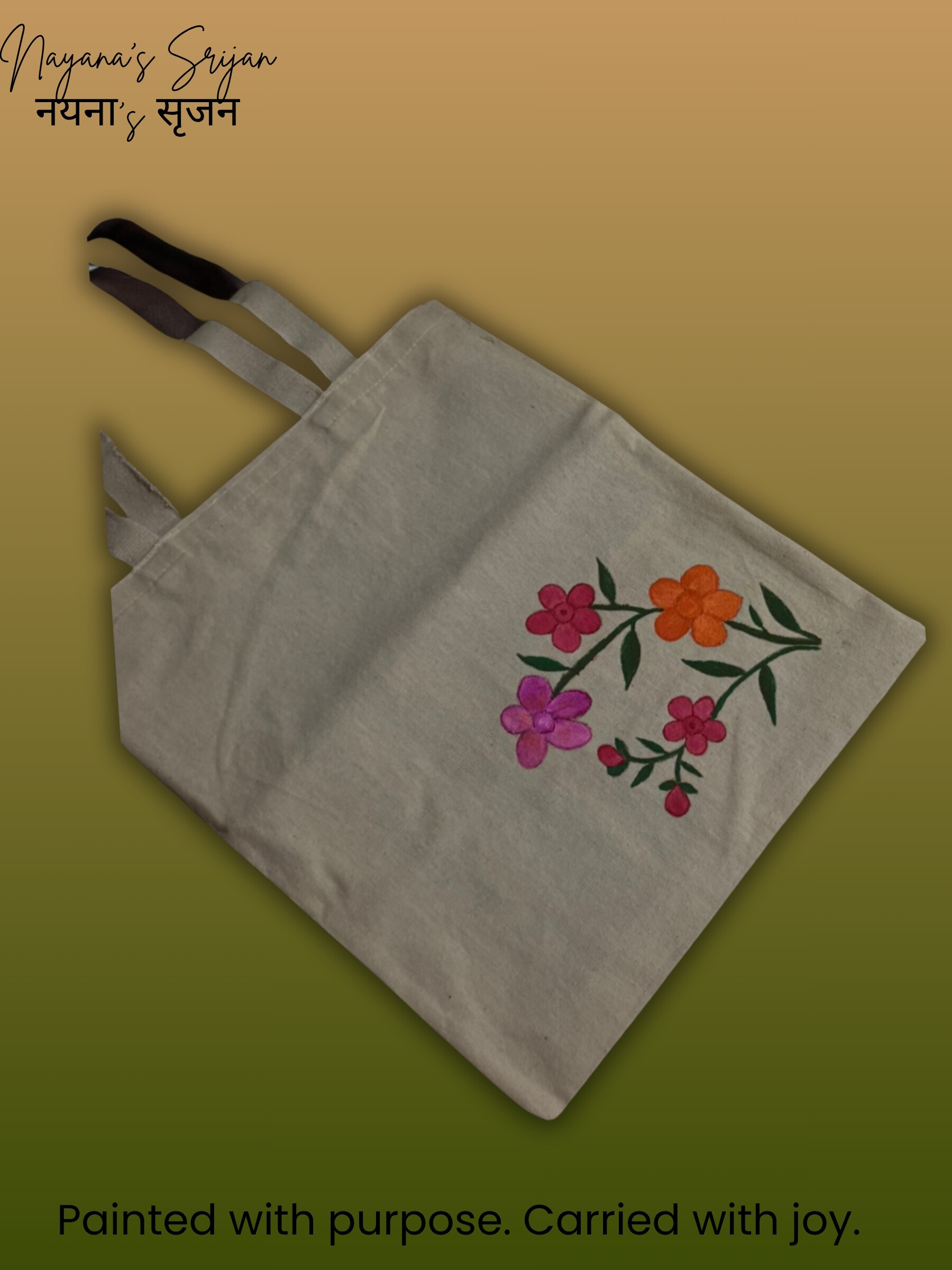 Tote bags and pouches hand-painted by Nayana Shah — one flower at a time, one bag at a time. No two alike.