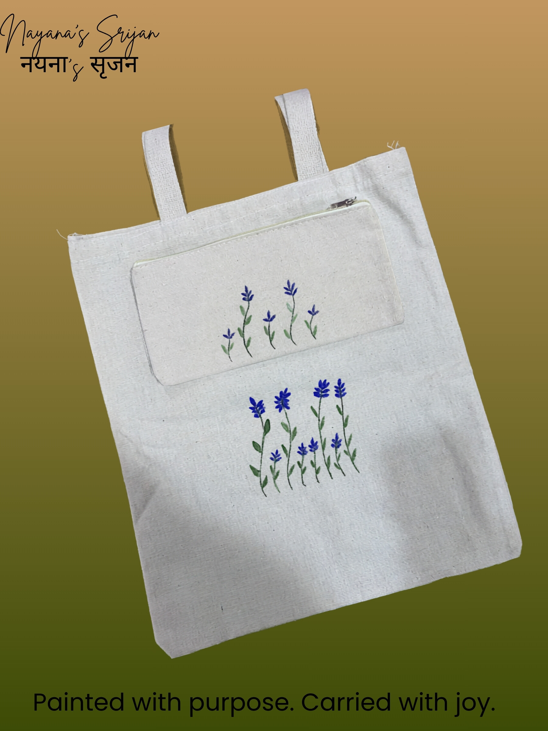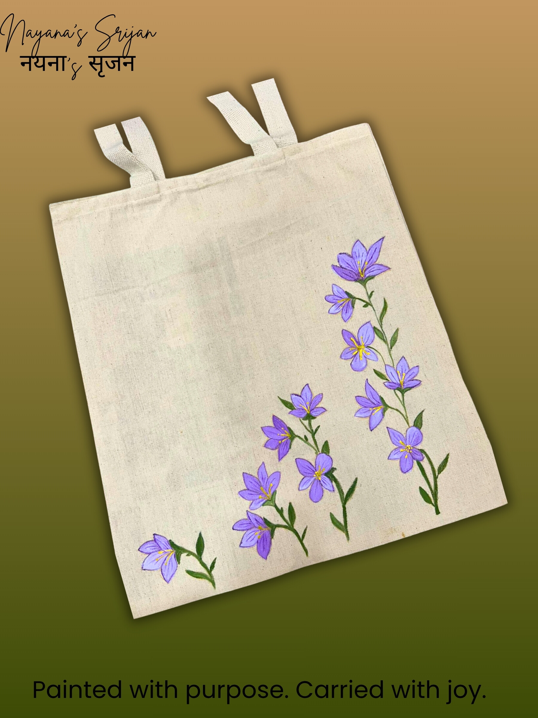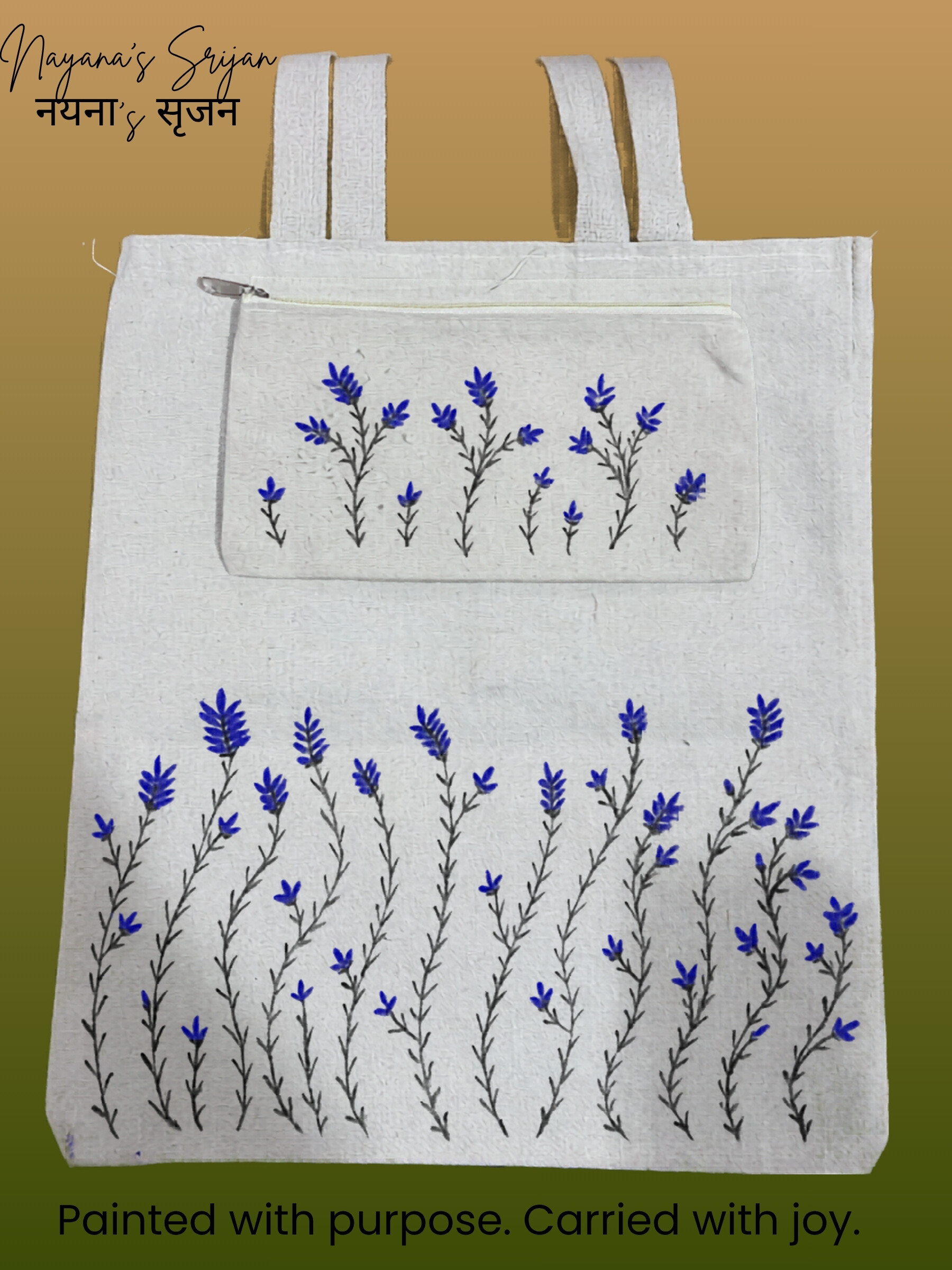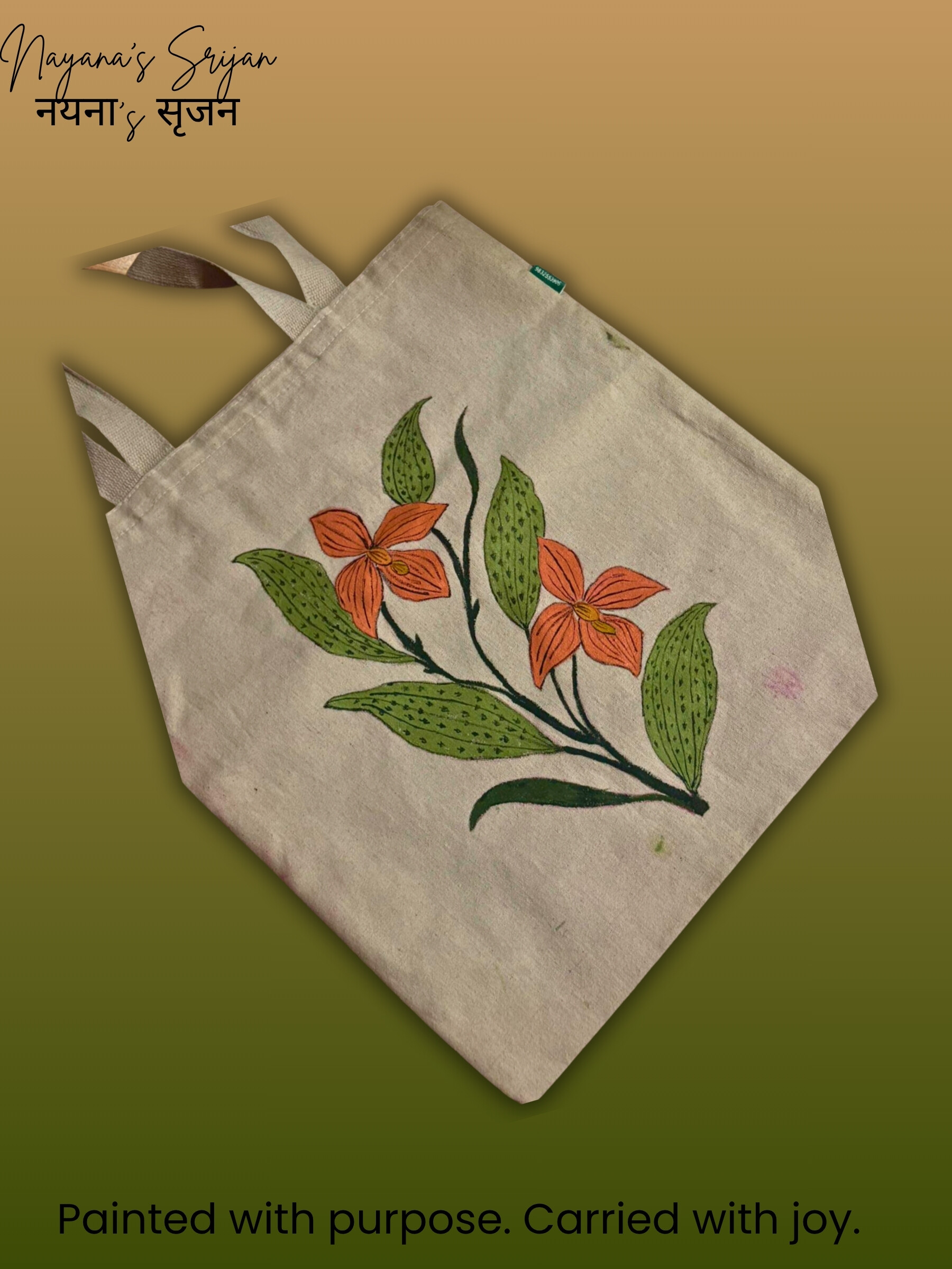 Tote bags and pouches hand-painted by Nayana Shah — one flower at a time, one bag at a time. No two alike.